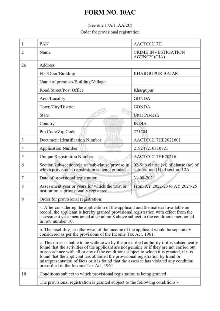 Our Certifications Registration Certificate 80G 12A CSR Registration Pan Card ISO Registration Copy Right Certificate CIA Registration NGO Darpan